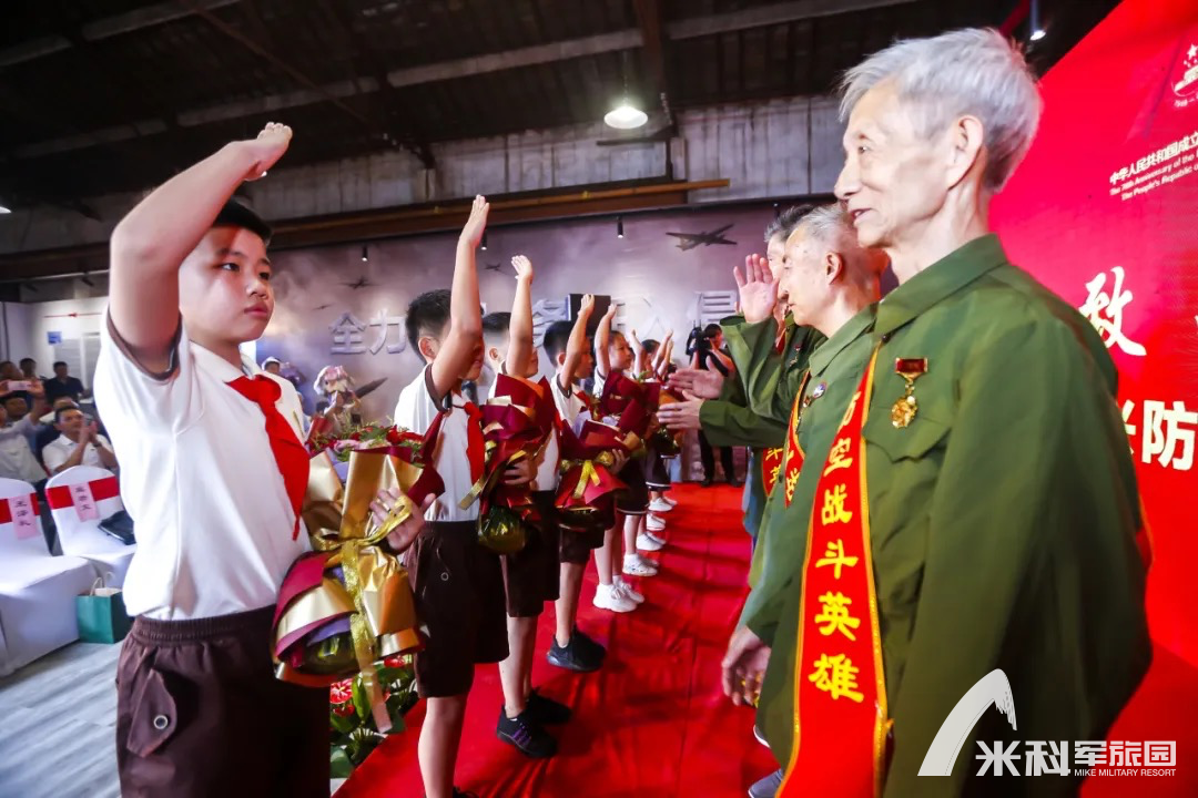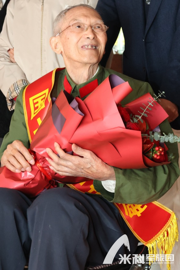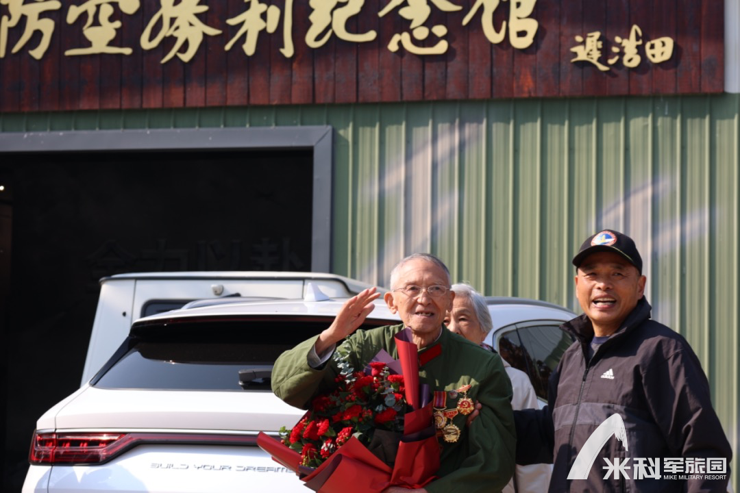 馆长向徐德桓献上鲜花,并为他佩戴上印有“国土防空英雄”字样的绶带