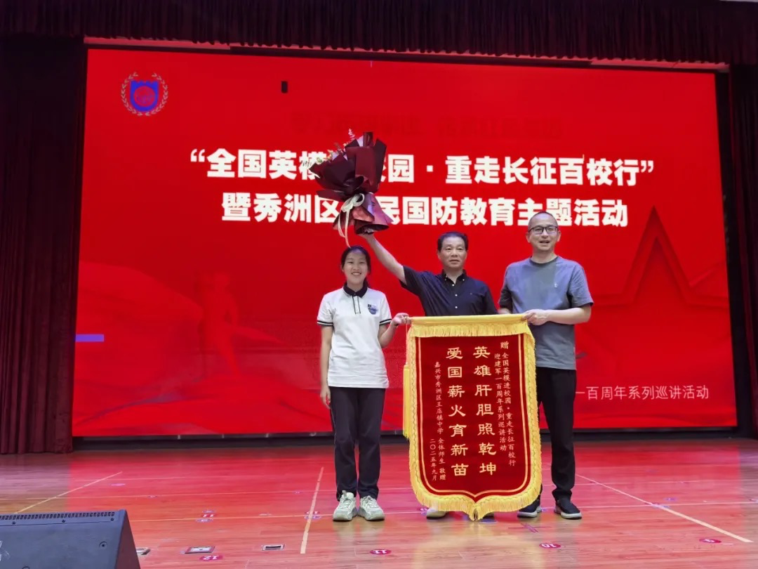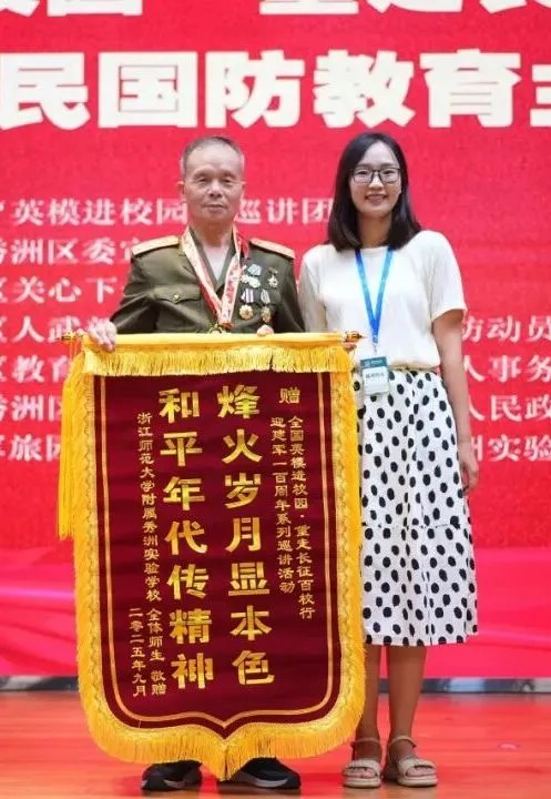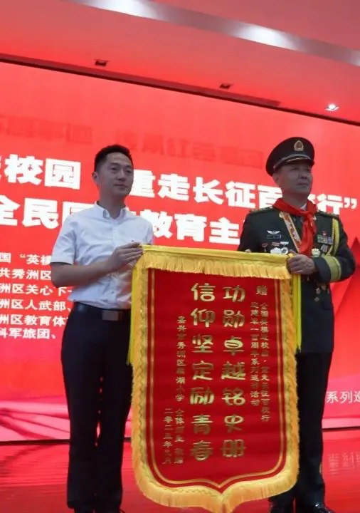 宋丽娟副校长郑重地将一面鲜红的锦旗赠予钱富生同志。这面锦旗凝聚着全校师生的崇高敬意,象征着对英雄精神的礼赞与传承。