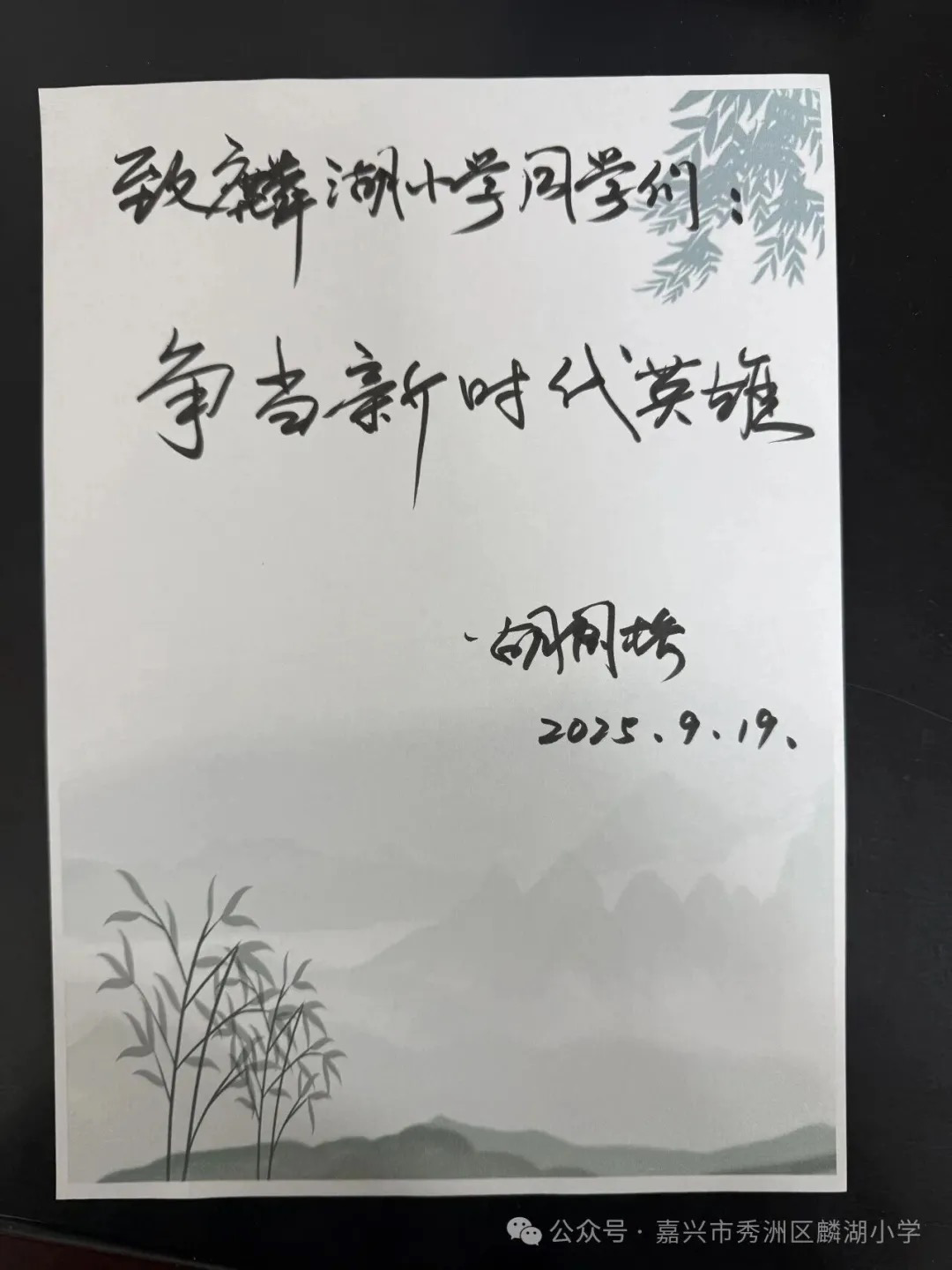 胡国桥英雄还为麟湖学子写下了“争当新时代英雄”的寄语,笔力遒劲,字字千钧。简短的七个大字,饱含着一位英雄老兵对少年一代的殷切期望,承载着薪火相传的厚重嘱托。这七个字如星火燎原,在孩子们心间点燃了信仰的灯塔,照亮前行的方向。