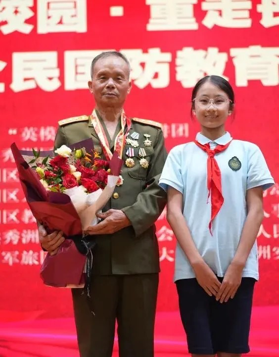 学生代表向钱富生同志行以最标准的队礼,将饱含敬意的鲜花献给心中的英雄。这一刻,新时代的少年与革命英雄深情相望,传承的不仅是鲜花,更是对英雄精神的崇高敬意和接续奋斗的坚定承诺。