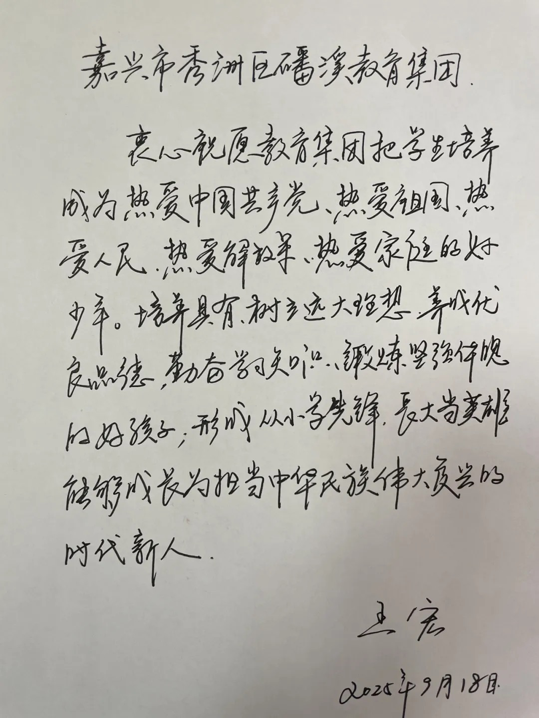 王宏英雄给学生们写寄语,希望下一代从小当先锋,长大当英雄。