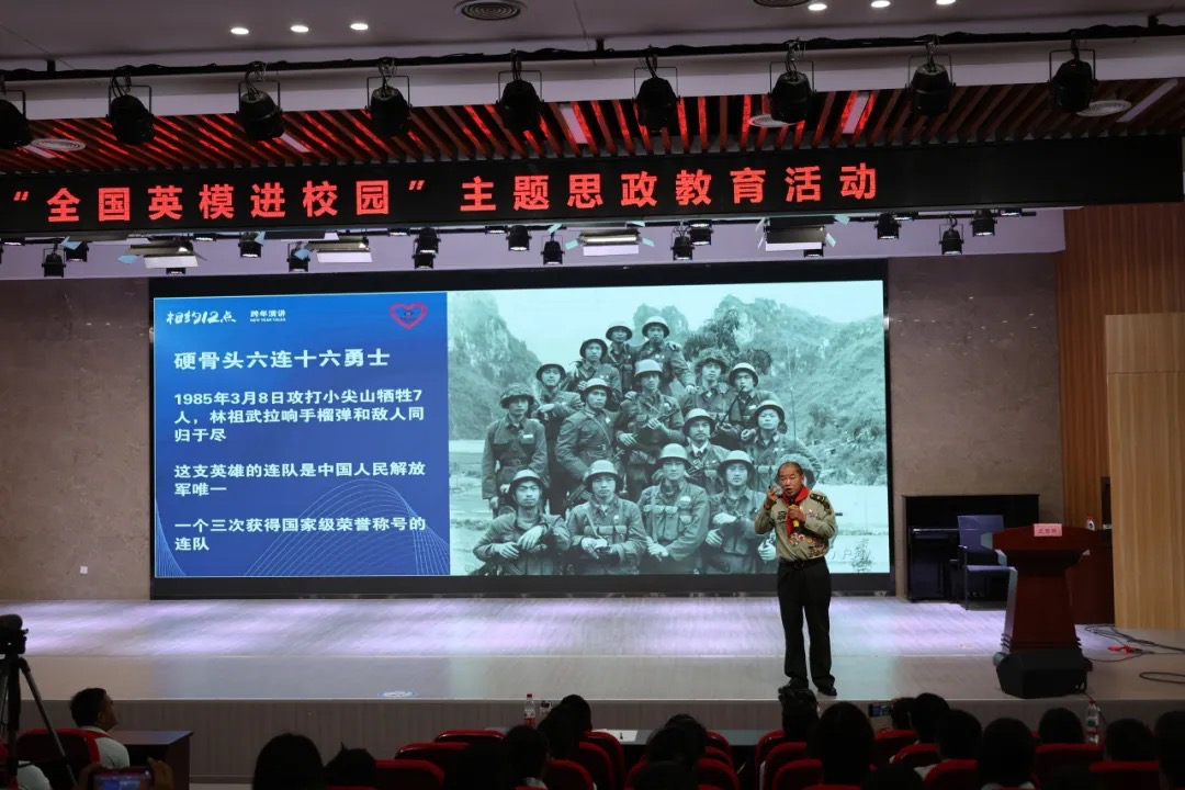 黄仲虎英雄以平实而铿锵的语言,深情讲述了自己在枪林弹雨中的亲身经历与惊心动魄的战斗故事。他将深厚的爱国情怀、坚定的理想信念和不怕牺牲的革命精神融入一个个真实的故事中,生动诠释了红色精神的时代内涵,并分享了如何在新时代传承与践行这一宝贵精神财富。台下师生凝神静听,无不为英模的英勇事迹和忠诚担当所深深打动,掌声经久不息。