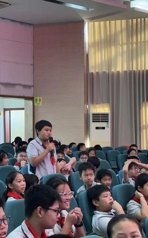 活动的最后,麟湖小学的小记者团围拢在胡国桥英雄身旁,稚嫩却坚定的声音此起彼伏:“您害怕过吗?”“是什么让您坚持下来的?”每一个问题都充满了敬仰与深思。胡国桥英雄俯身倾听,耐心作答,言语中没有豪言壮语,只有责任、信念与时代赋予的使命。小记者们认真记录,眼神里闪烁着光芒,仿佛一颗颗红色的种子正在悄然萌芽。
