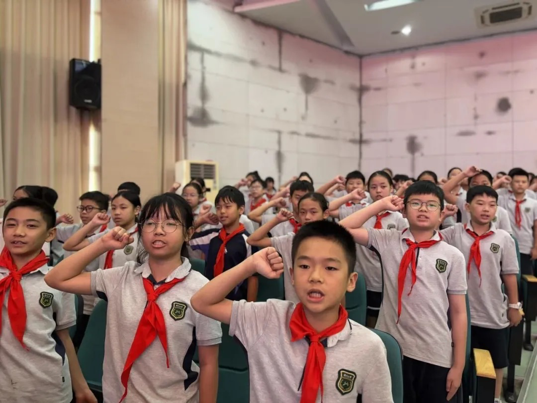 全体师生肃立高举右拳,在钱富生同志的见证下庄严宣誓。铿锵有力的誓言在报告厅内久久回荡,展现了新时代青少年传承红色基因、担当民族复兴重任的坚定决心。这场庄严的宣誓仪式将整场活动推向高潮,让爱国主义的种子深深植根于每个人的心中。