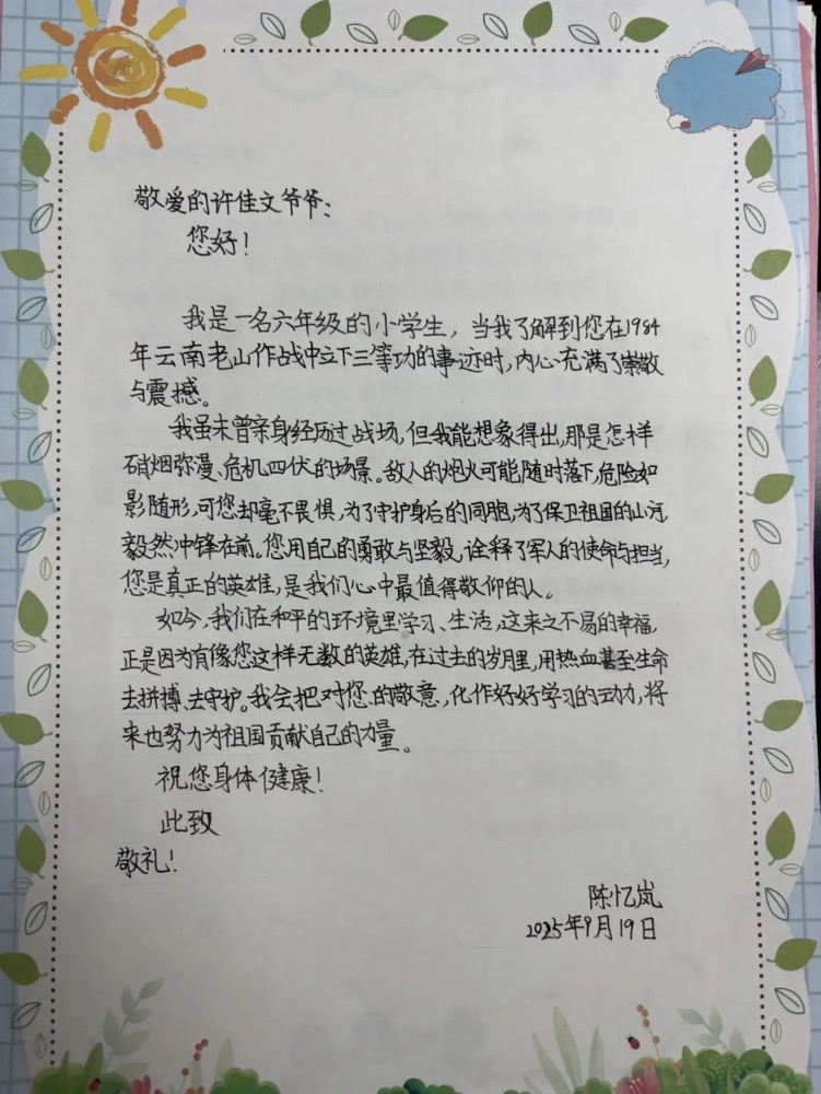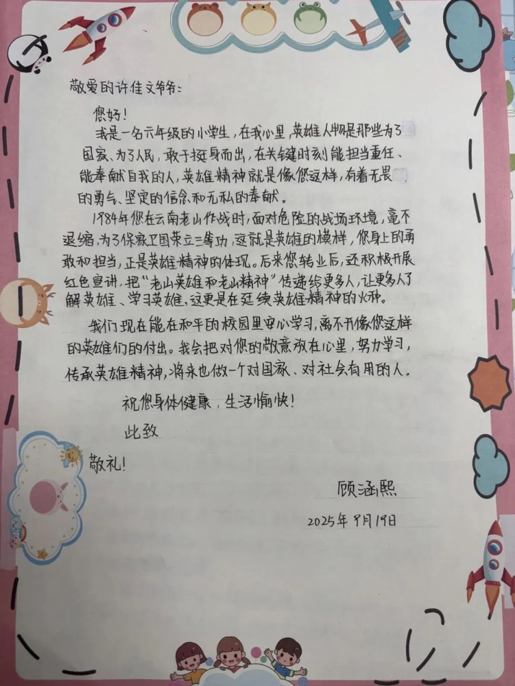 不仅如此,学生们还纷纷将精心绘制的画作和饱含敬意的书信送到英模手中,用稚嫩的笔触和真挚的文字表达对许英雄的崇拜与感恩。一幅幅色彩斑斓的绘画和一封封情真意切的书信,既展现了新时代青少年对英模精神的传承,也凝聚了他们对爱国奉献精神的深刻理解。